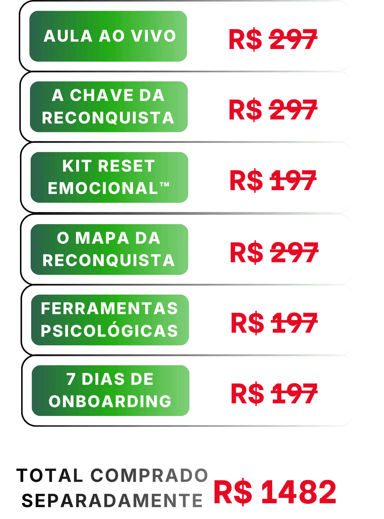 A estrutura completa da reconquista, com etapas organizadas de forma estratégica. Você aprende não só o que fazer, mas por que cada fase prepara a próxima.